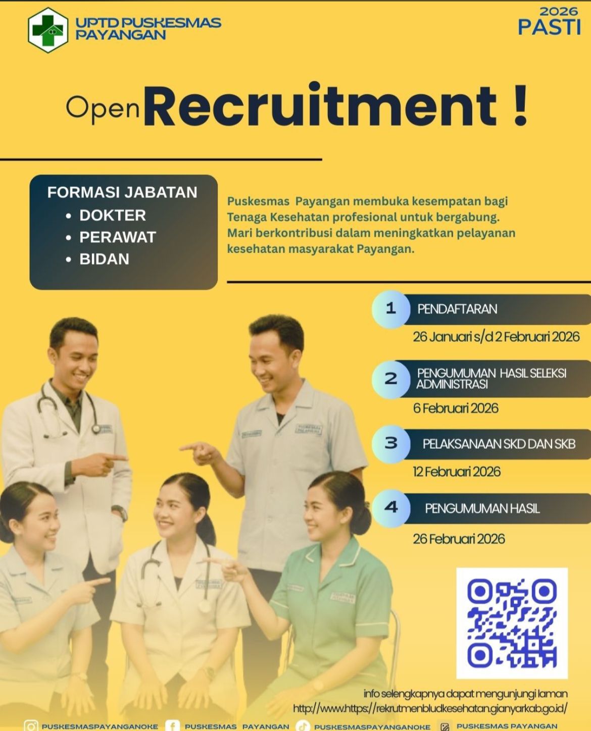 UPTD Puskesmas Payangan secara resmi membuka Open Recruitment Tenaga Kesehatan Tahun 2026. Kesempatan ini ditujukan bagi tenaga kesehatan yang berdedikasi, kompeten, dan siap berkontribusi dalam pelayanan kesehatan masyarakat.